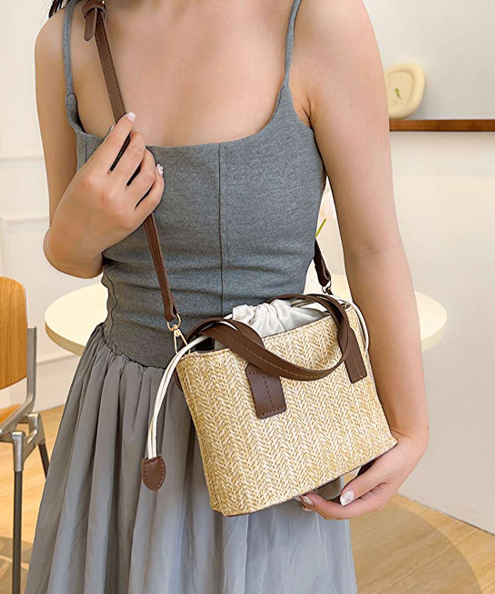 夏っぽい麦わら素材とフェイクレザーがカジュアルになり過ぎず、小さめで持ち運びも楽々