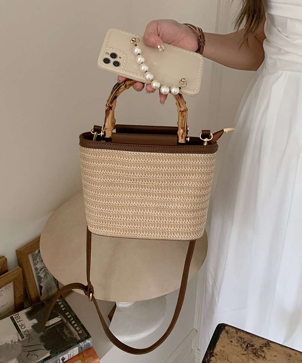 夏っぽい麦わら素材とフェイクレザーがカジュアルになり過ぎず、小さめで持ち運びも楽々