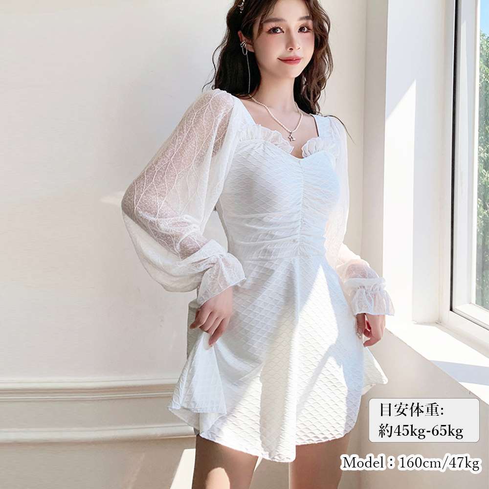 体型カバーできるエレガントな韓国風袖シースルーワンピ水着