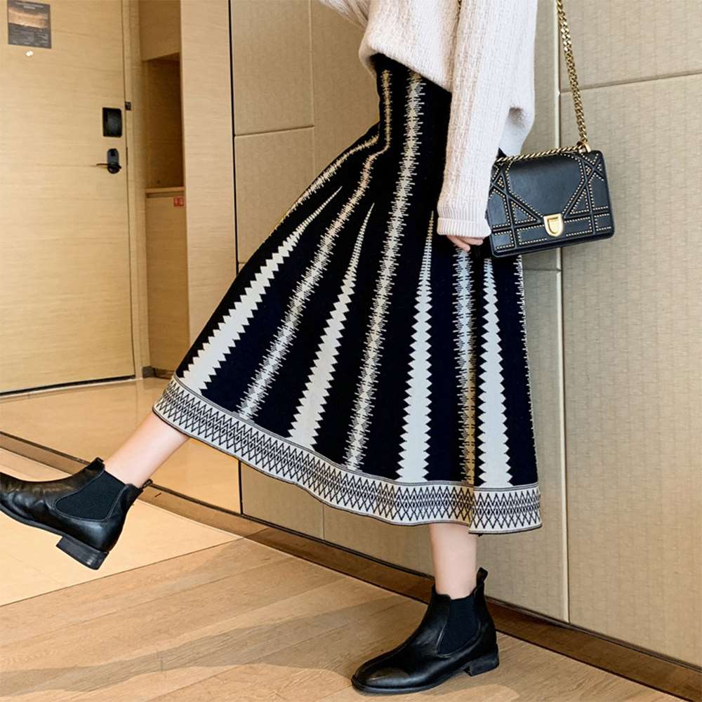 レトロで大人っぽい雰囲気を演出する幾何学柄ニットフレアスカートです