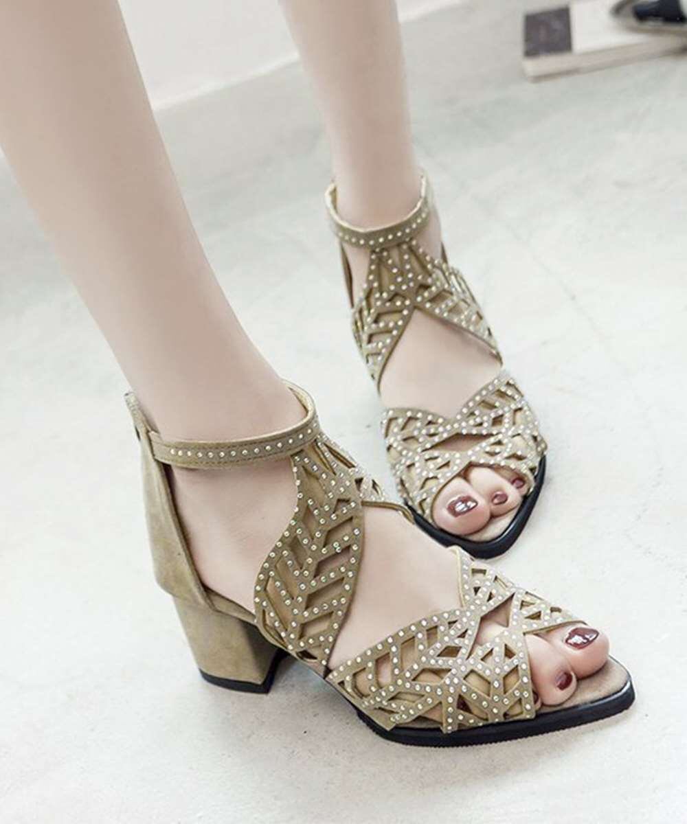 アッパーにラインストーンが入っており、キラキラと華やかに足元を演出するチャンキーヒールサンダル。