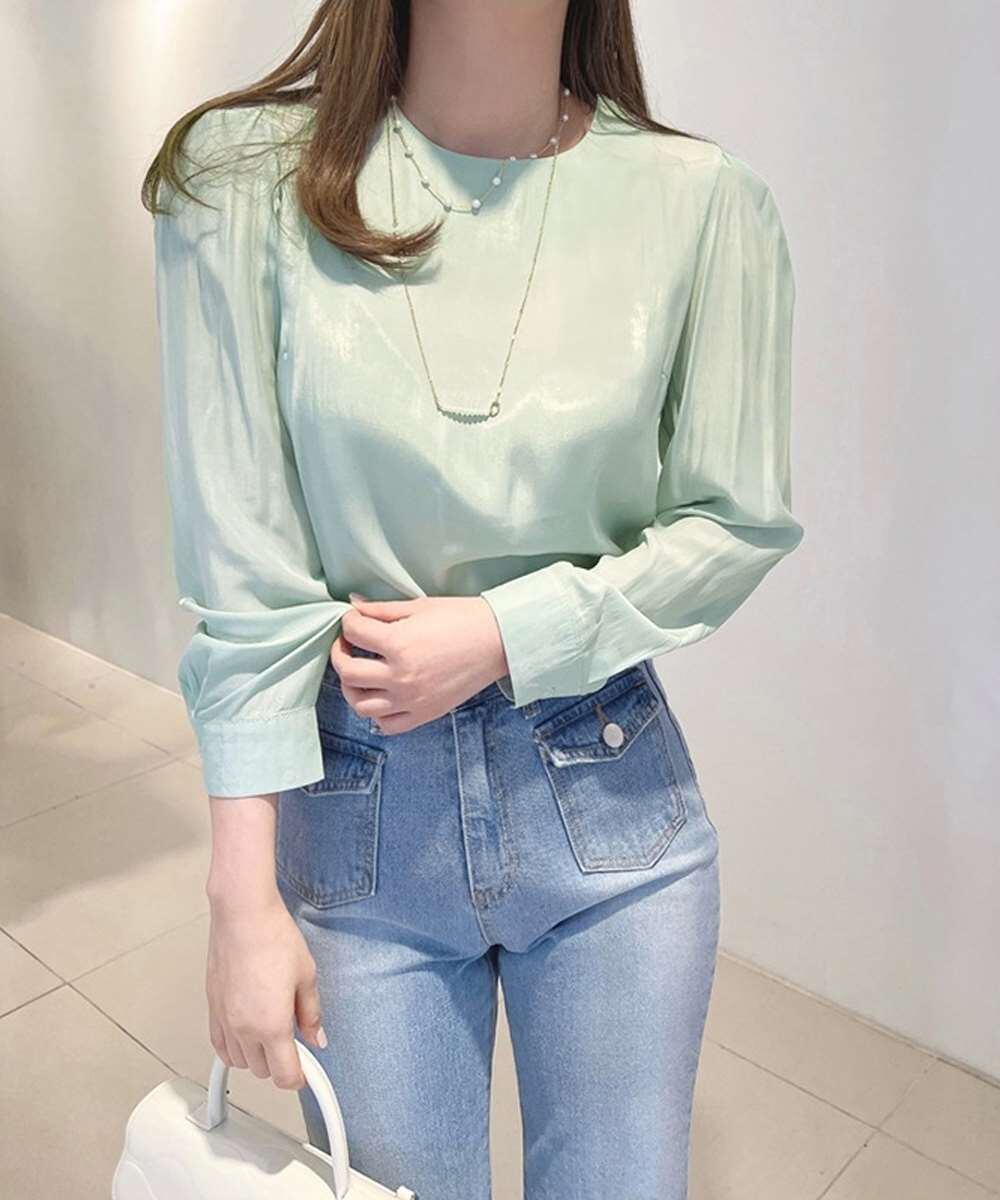 とろみ感のある素材が女性らしさを演出するパフスリーブブラウス