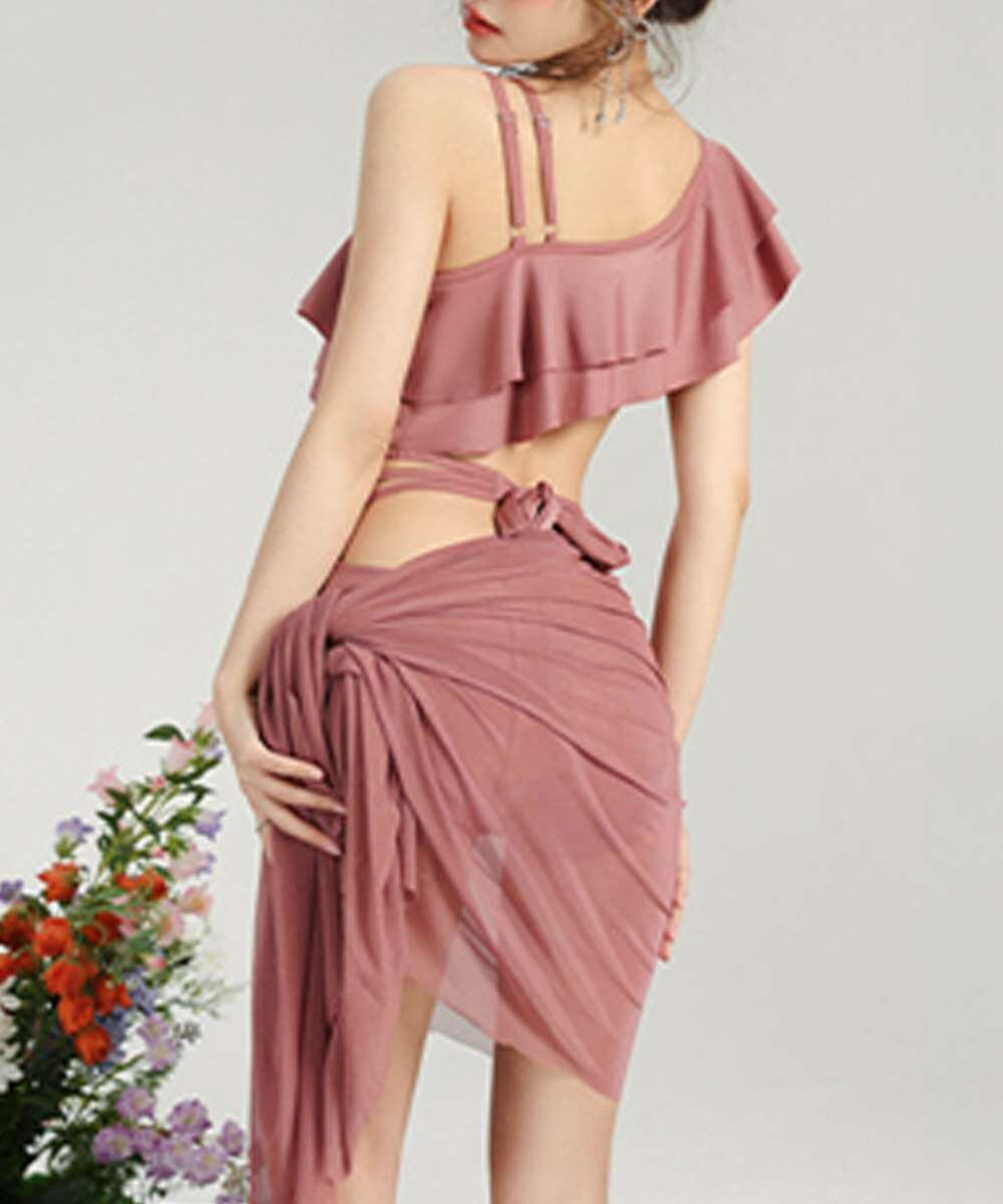 セットのパレオを巻けば、気になるヒップラインをカバーしつつ、ドレス感が一層高まった装いが楽しめる。