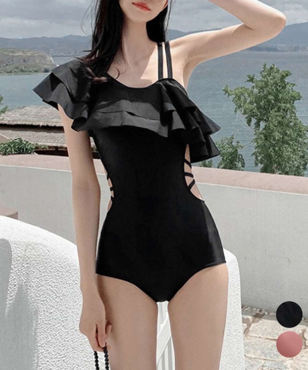アシンメトリーフリルが優雅なワンショルダー型ワンピース水着。