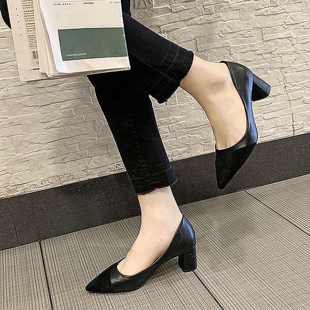 女性らしいポインテッドトゥで仕上げた、チャンキーヒールパンプスです