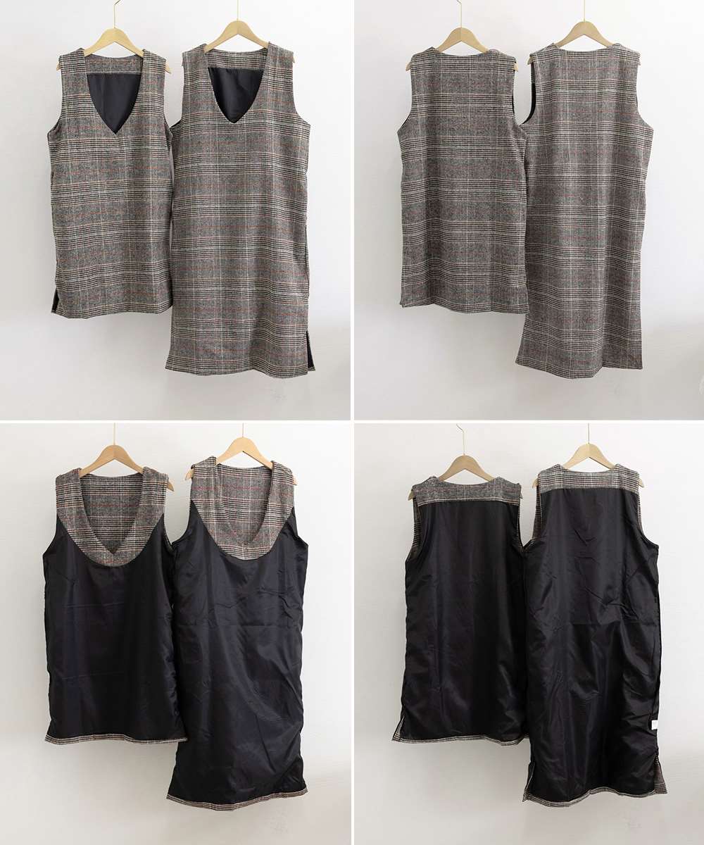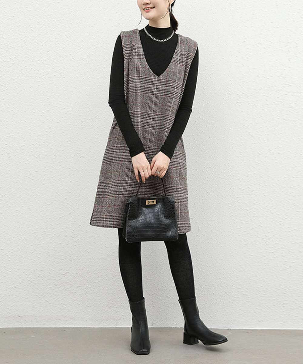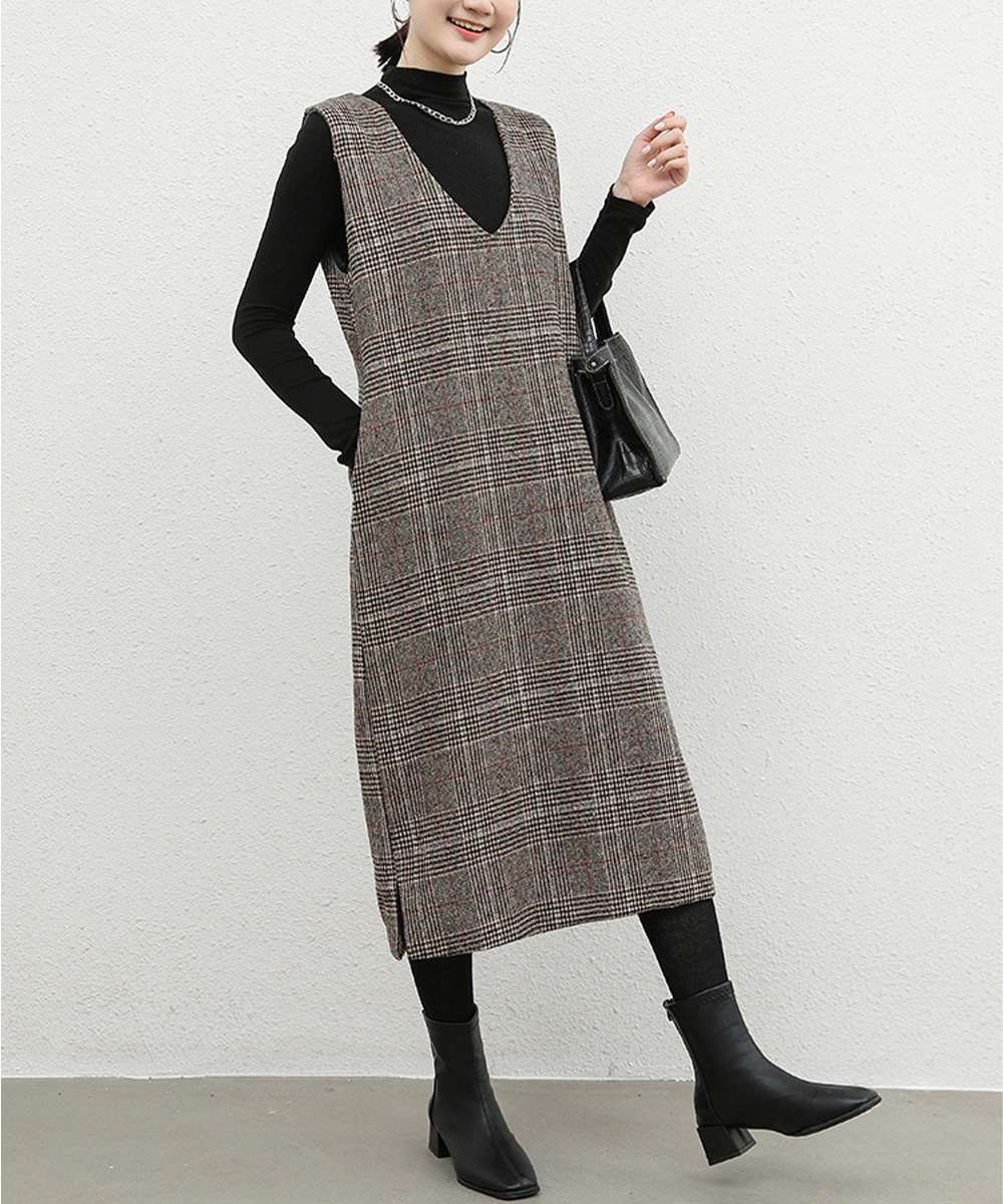Vネックでゆったりとしたシルエットが魅力のストレートチェック柄ジャンパースカート
