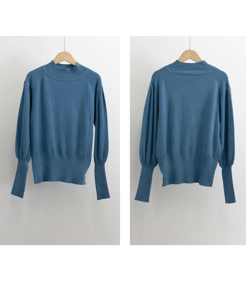 首元を包み込むプチハイネック仕様で、シンプルながらもエレガントな印象を演出するニットトップスです