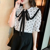 大き目なボウタイが顔回りを華やかに演出してくれドット柄ブラウス