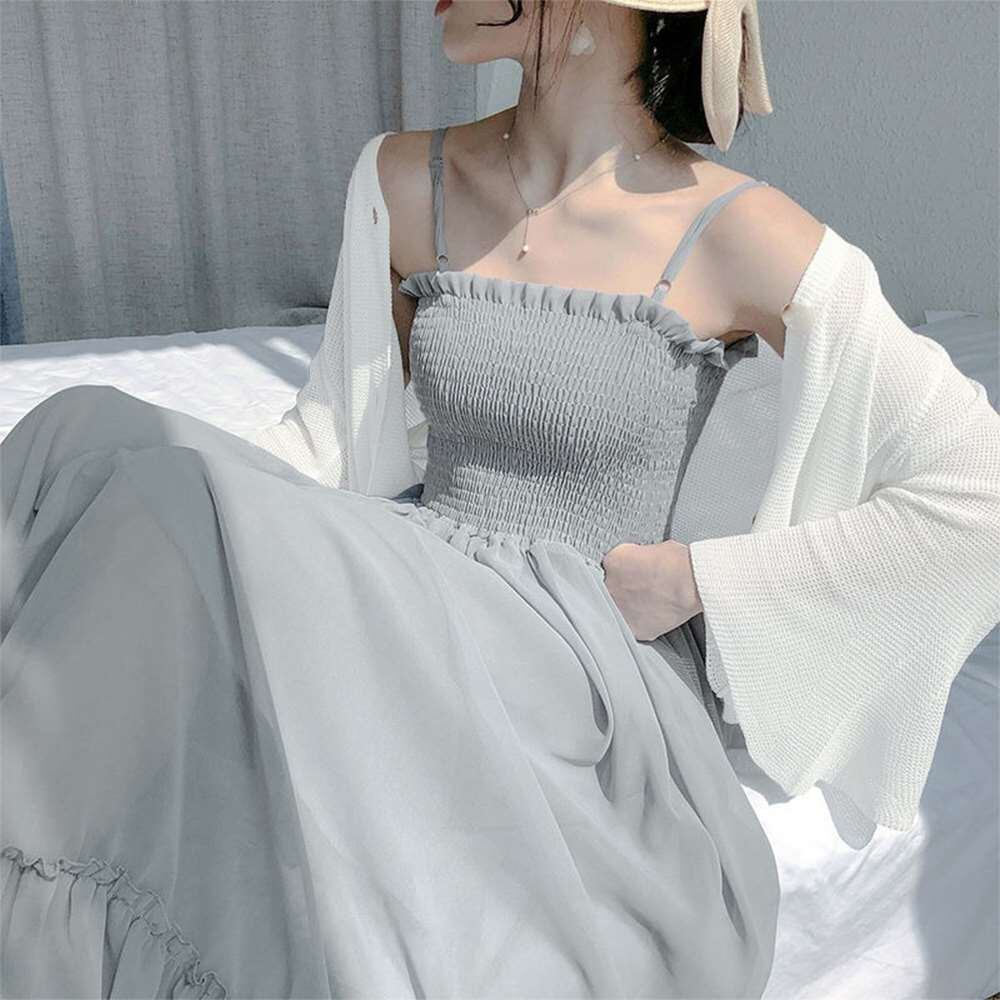 おしゃれで女性らしく優しい印象を与えるキャミワンピースとニットカーディガンのセットアップです