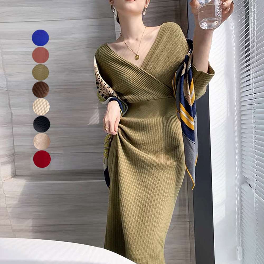 エレガントに女性らしさを引き立てる前後Vネックカシュクールニットワンピースです。
