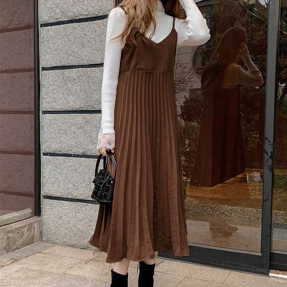 プリーツ キャミソール ワンピース レディース 重ね着 ロング 無地 フェミニン