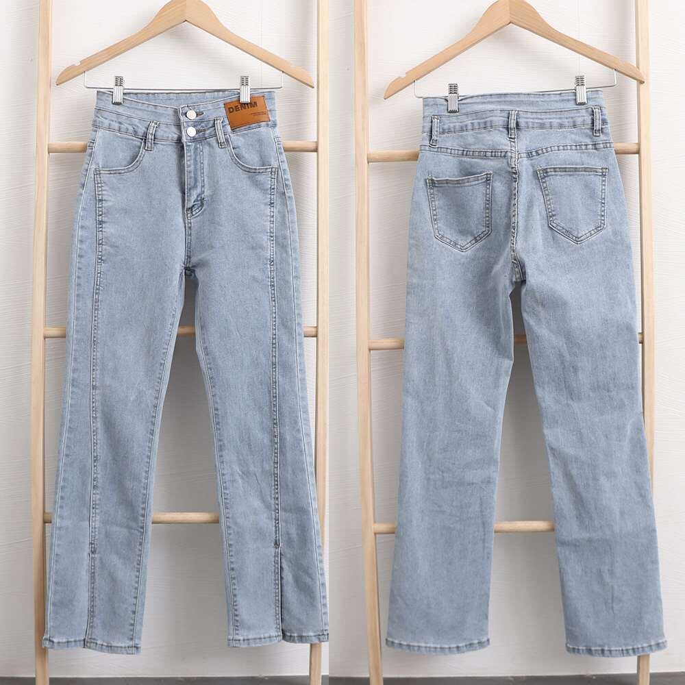 女性らしい曲線美を見せるフレアラインが魅力的なフロントスリットデニムパンツ