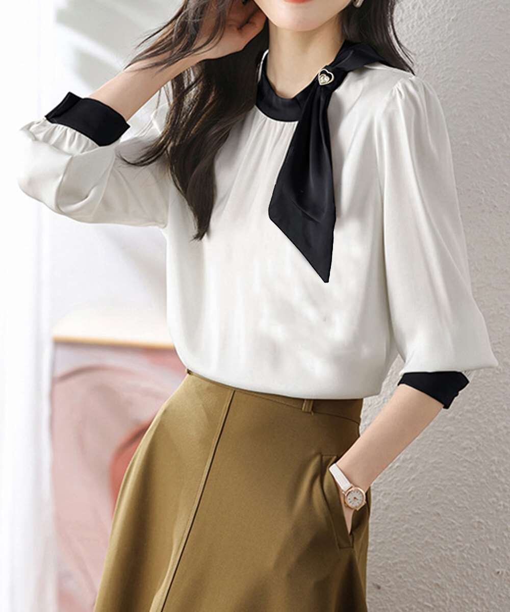 滑らかな生地で触り心地も良く、ポイントのボウタイと袖口のバイカラー配色が洗練された雰囲気を演出
