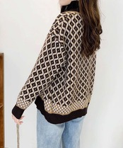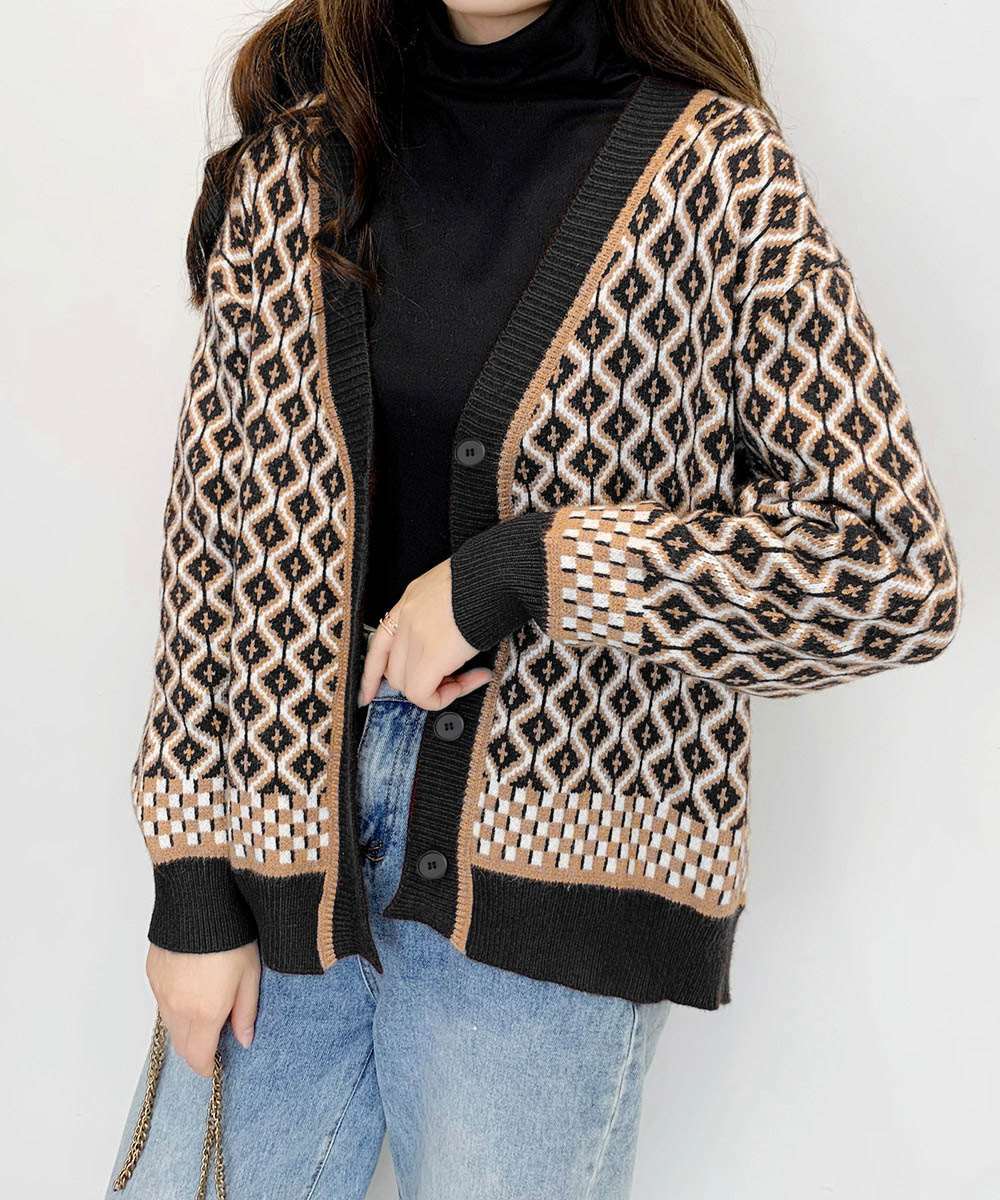 パッと目を引く幾何学模様の総柄が、コーデに華やかさを加えた韓国DESIGNのジャガードニットカーディガン