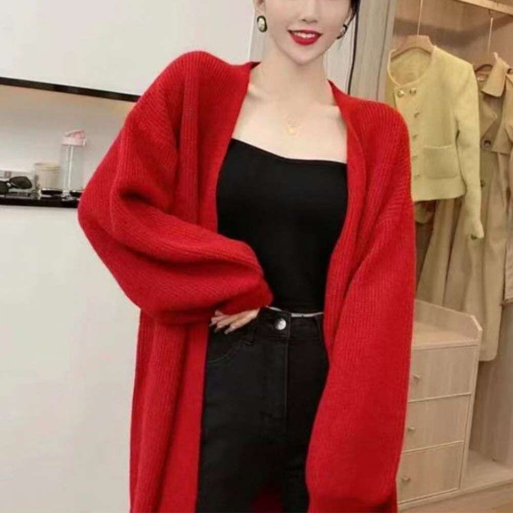 ゆったり羽織れるロング丈のボリュームスリーブトッパー仕様ニットカーディガン