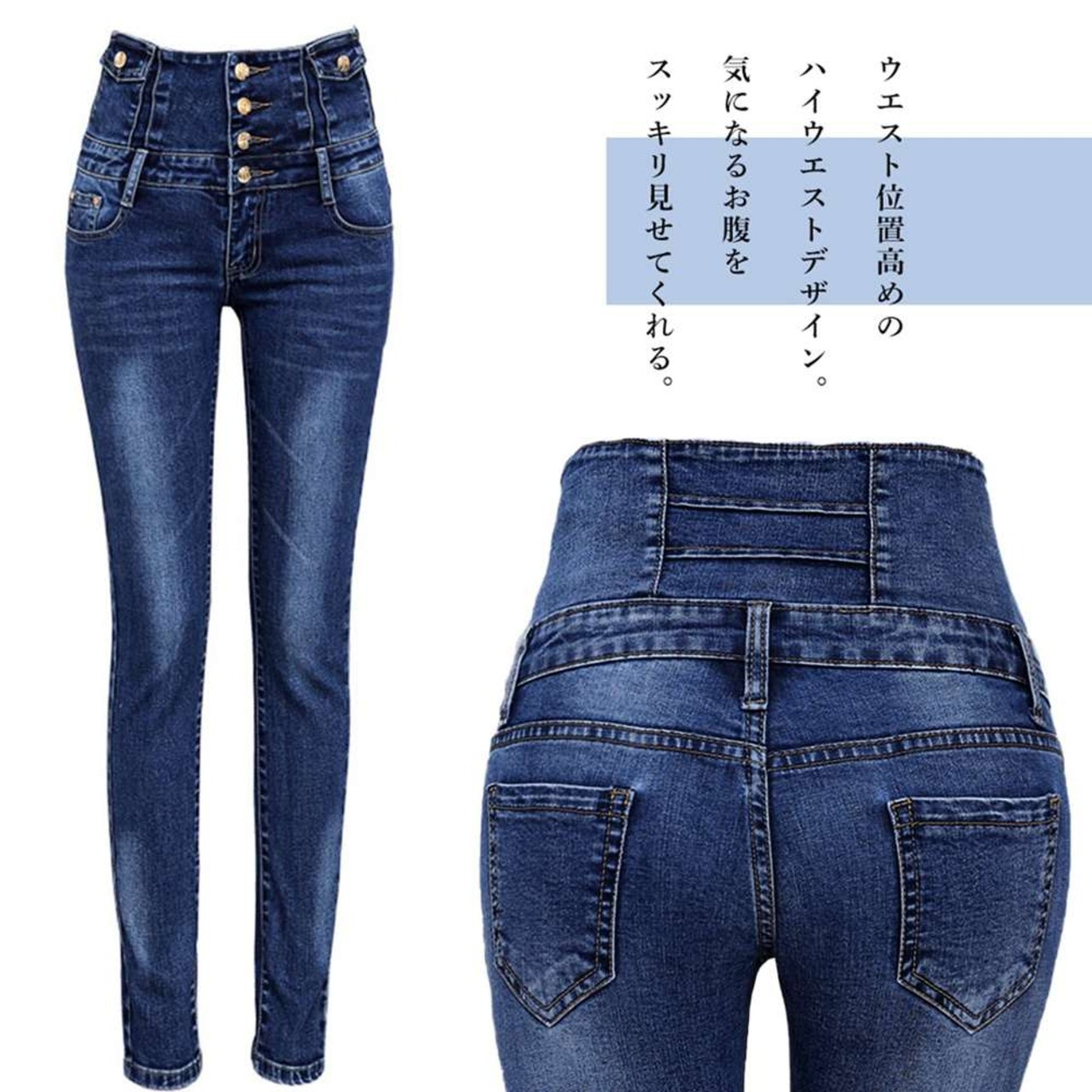脚長、スタイルアップ抜群のハイウエストボタンスキニーデニムパンツ