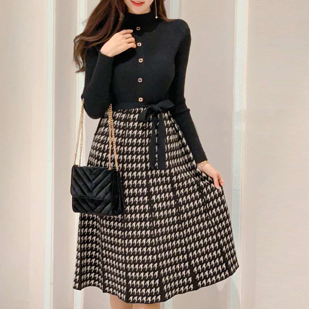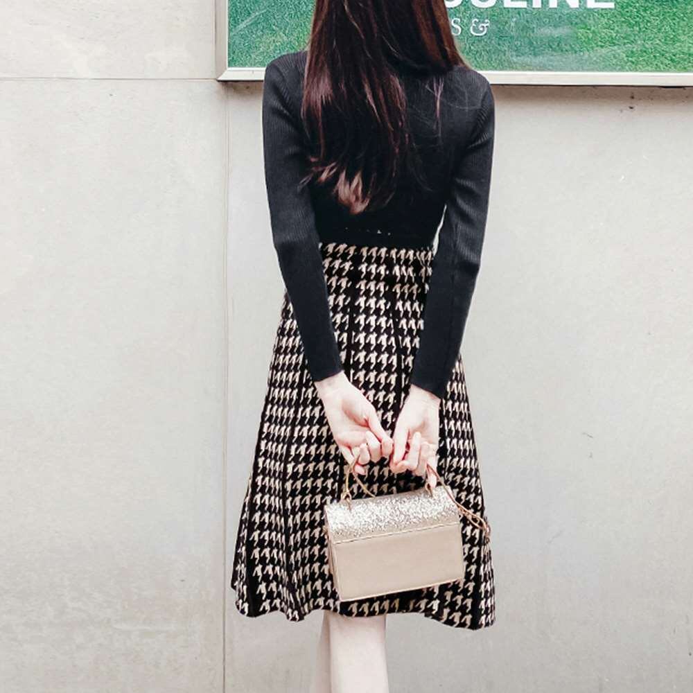 キーワード:ニットワンピ千鳥柄 体型カバー ニット フェミニン ワンピ