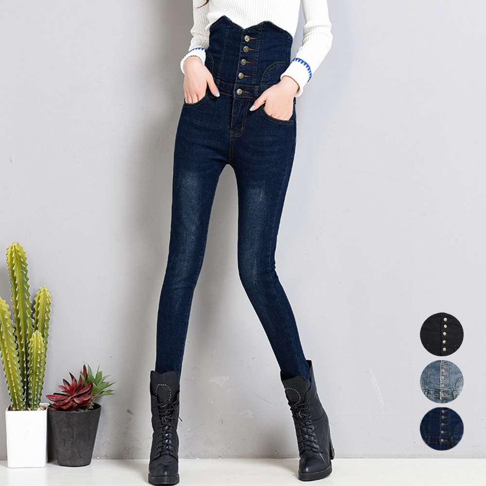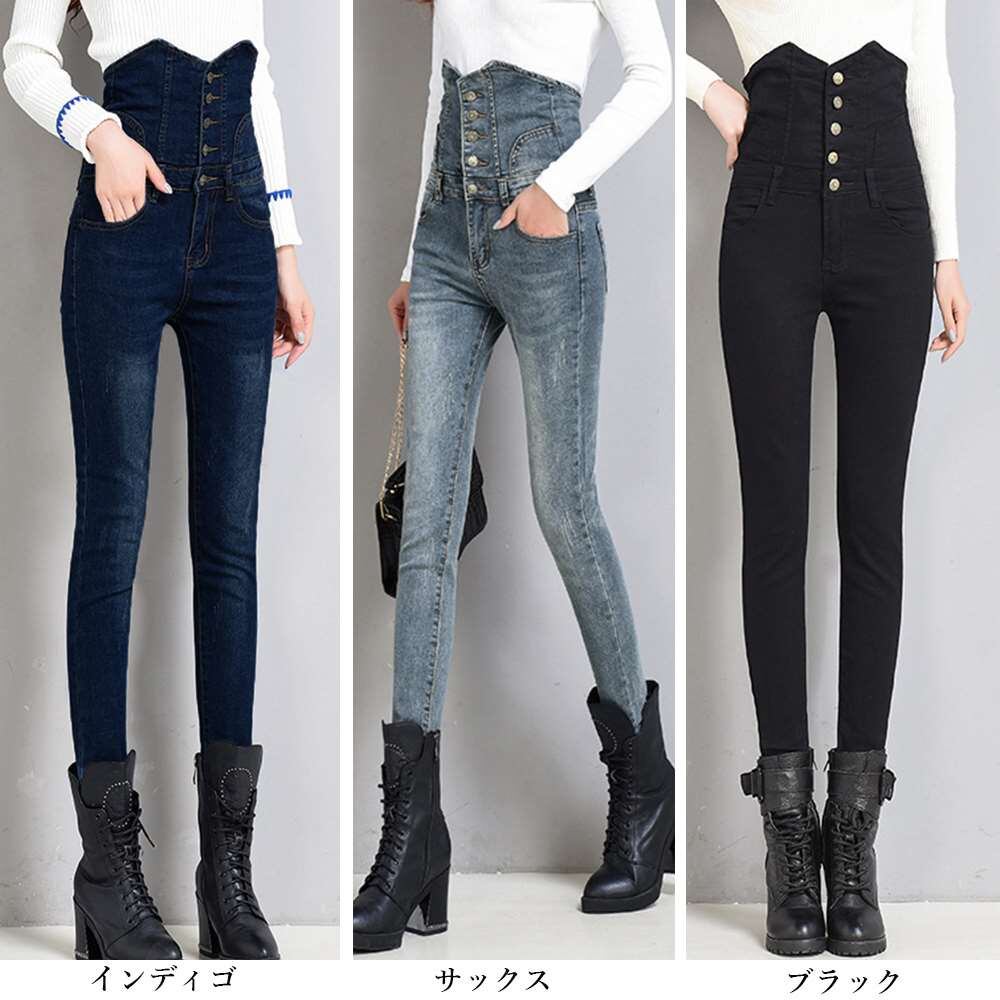 Vカットウエストが個性的、カジュアルながらもトレンディで他と被らないシングルブレストスキニーデニムパンツ