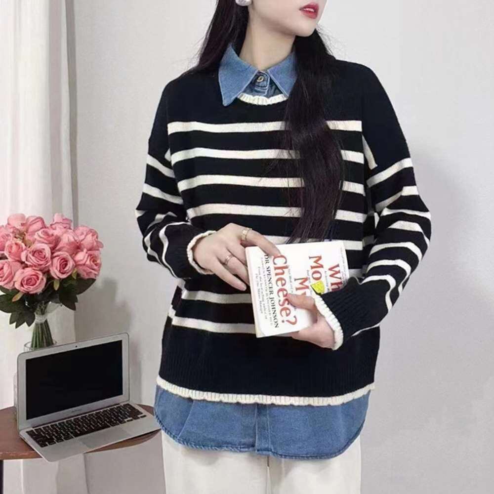 ボーダー柄ニット素材に重ね着風にドッキングした襟元と裾デザインがトレンド感満載のドロップショルダー切り替えトップス