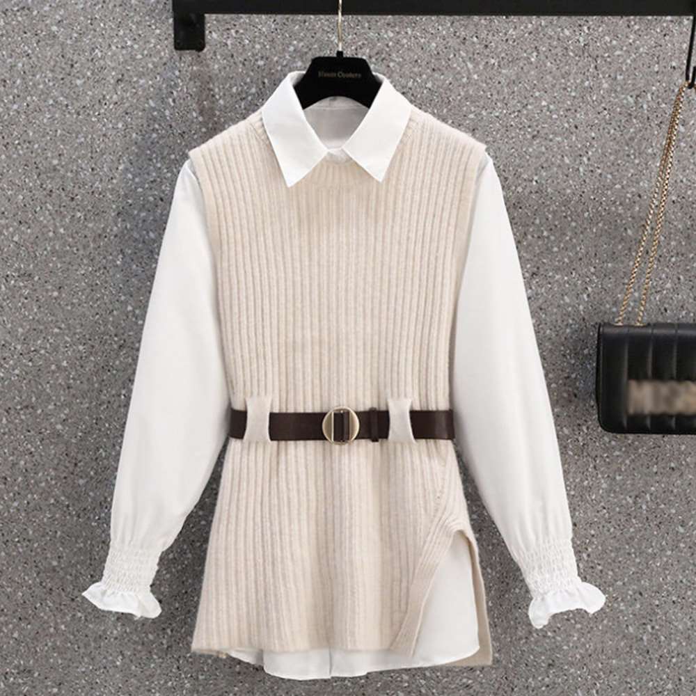 シャーリング袖のブラウス、ニットベストとベルトの3点セットです