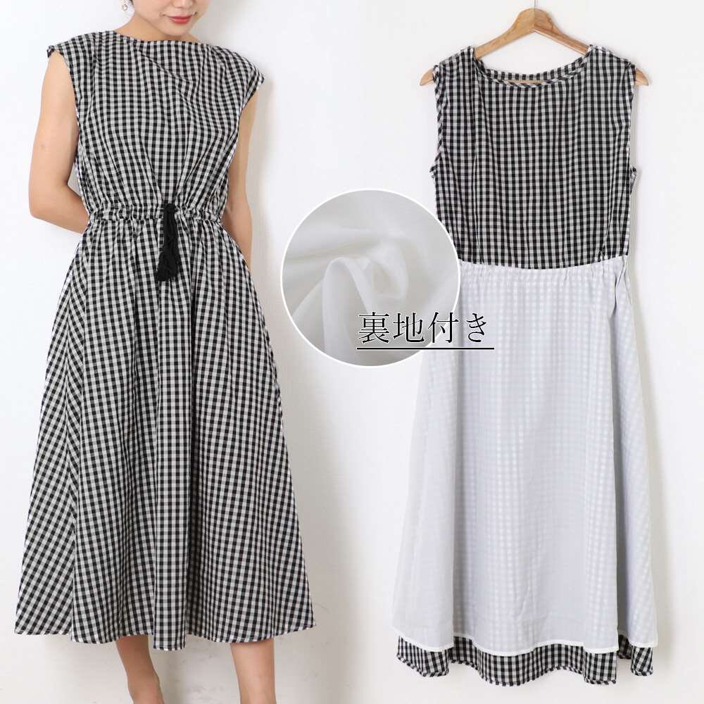 リネン ワンピース レディース ウエストゴム チェック柄 ロング ウエストシャーリング