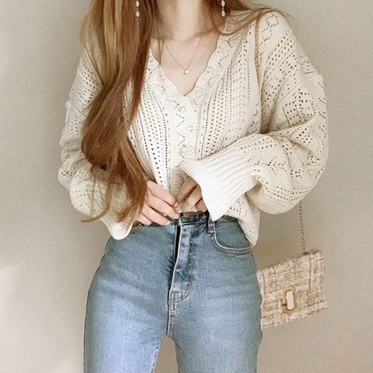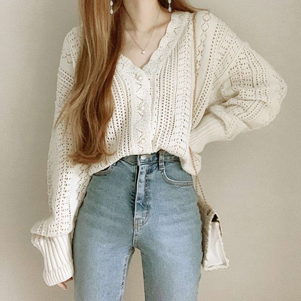 ゆるっとしたシルエットとぽわん袖がトレンド感満載の透かし編みロングスリーブニットカーディガン