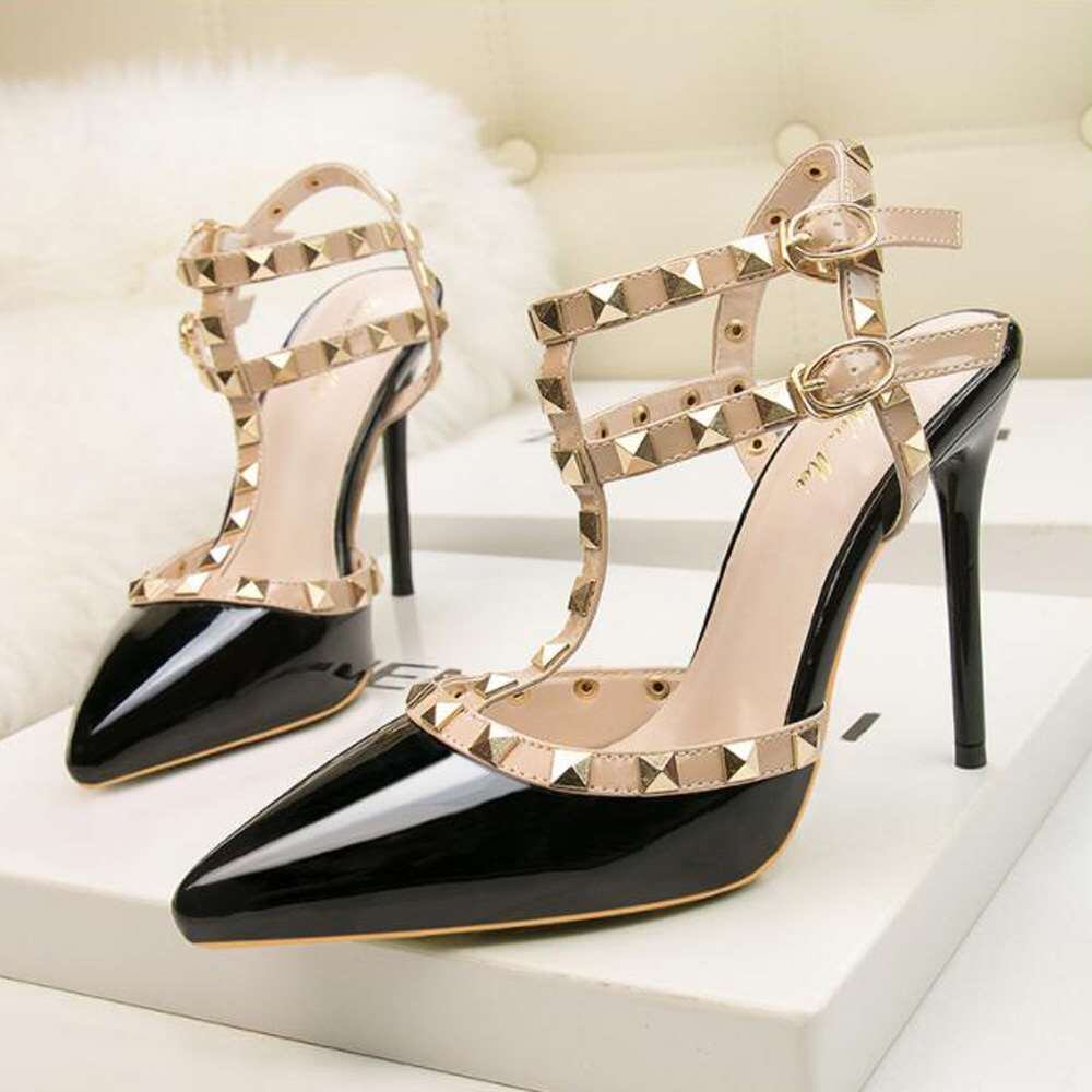 ピラミッドスタッズデザインが人目を惹いてしまうアンクルストラップピンヒールパンプス
