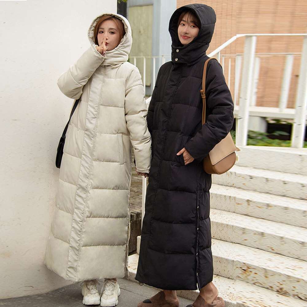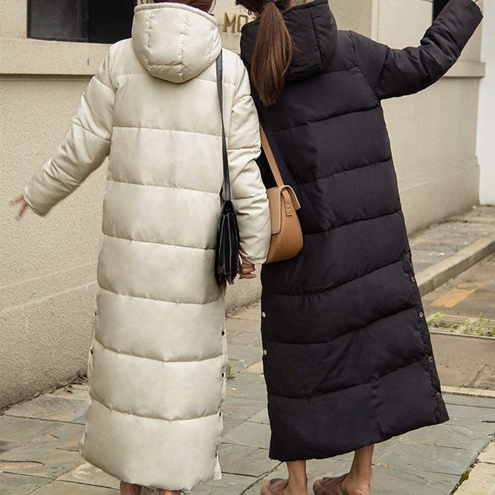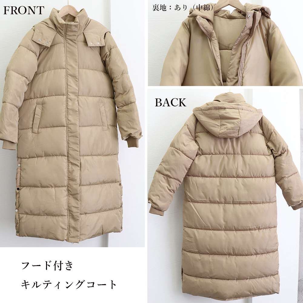 スタンドカラーにフード付きで顔周りをすっきり魅せ、暖かく守ってくれる中綿入りキルティング仕様のロングコート