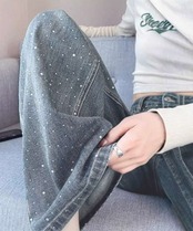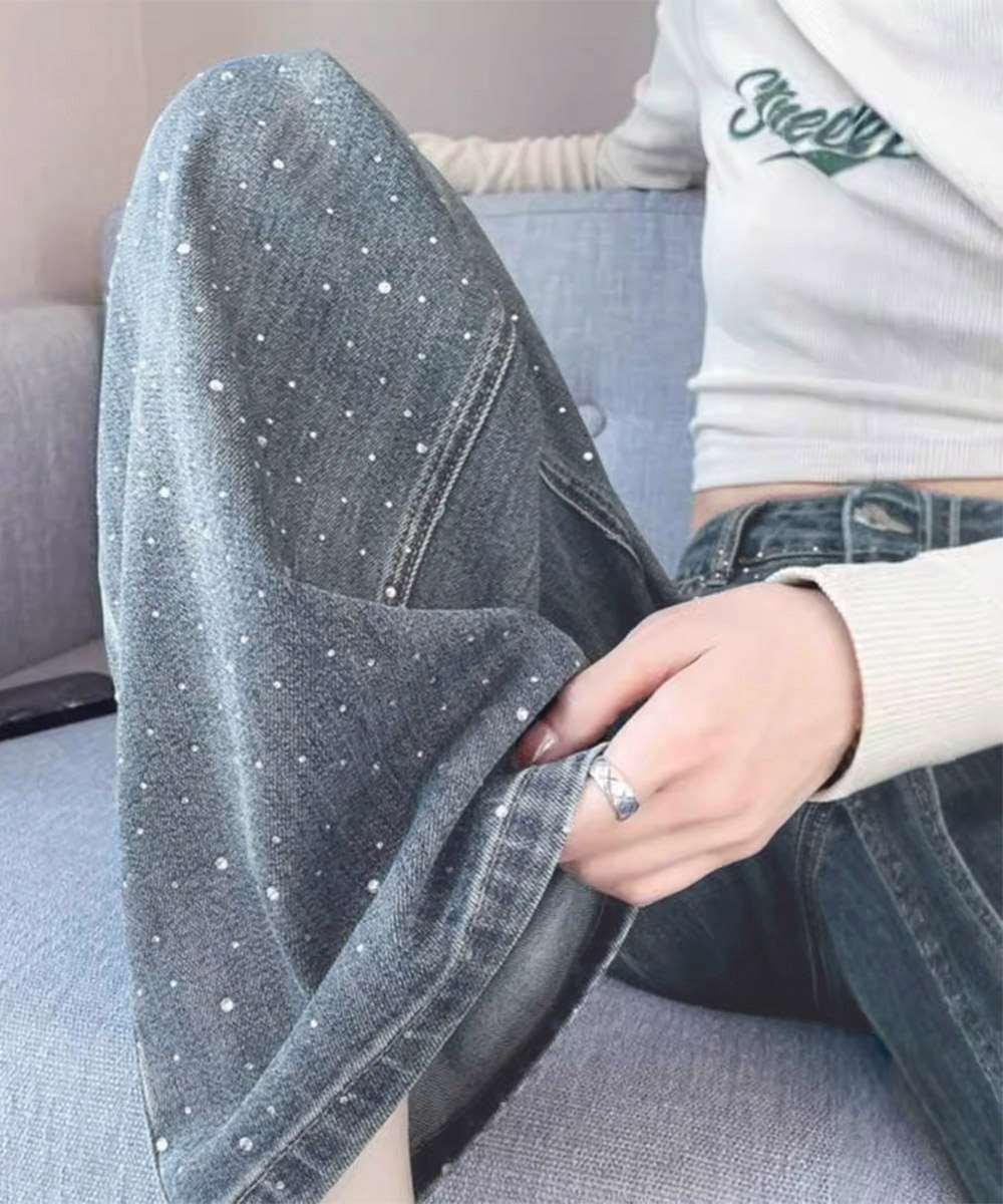 ラインストーンが散りばめられ、動くたびにきらきらと輝く、存在感抜群のレディースデニムパンツ