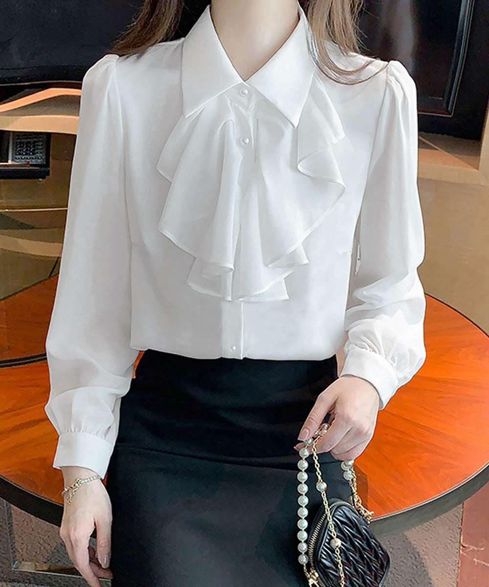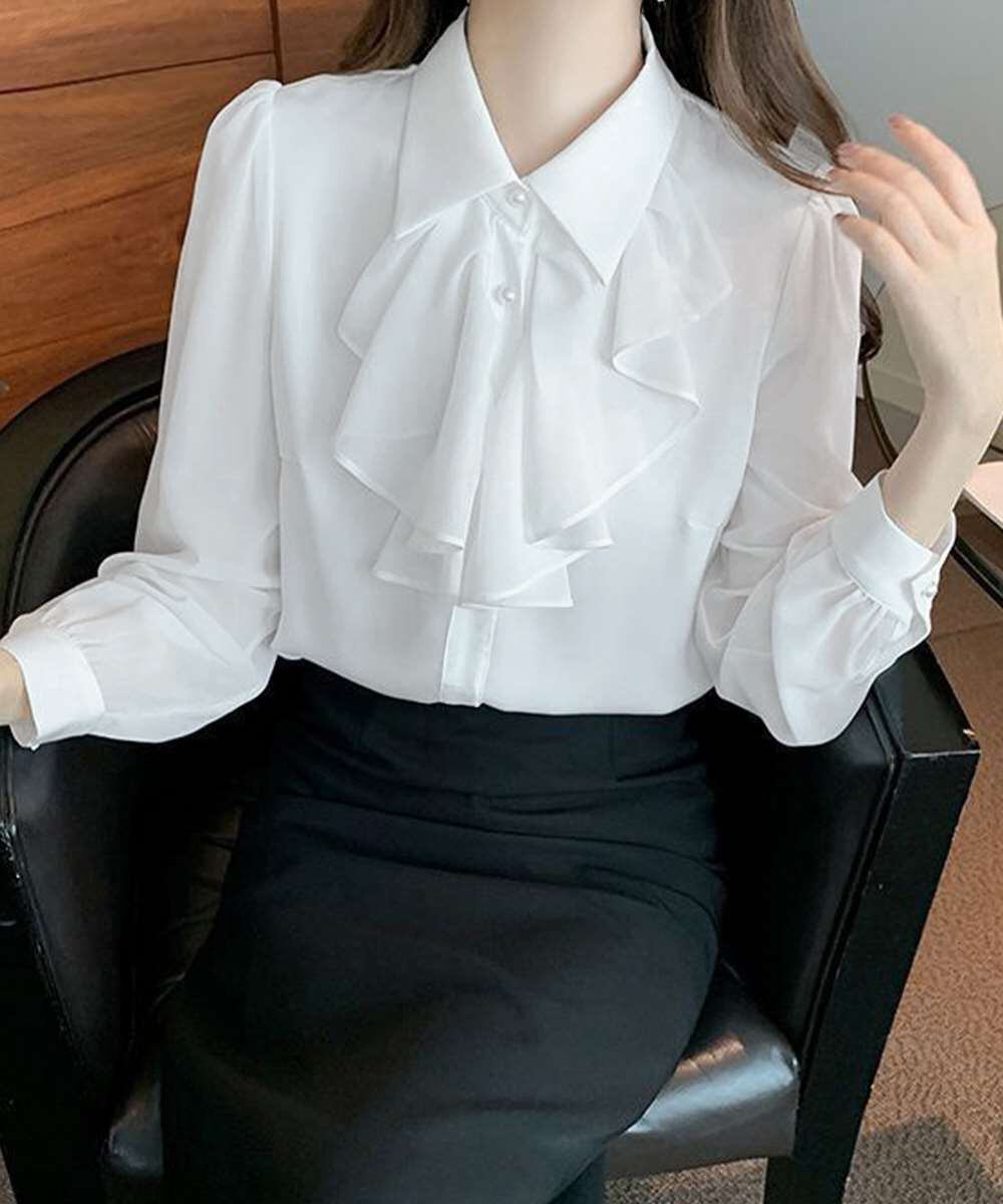 エレガントな雰囲気を漂わせるフリルリボンタイブラウス
