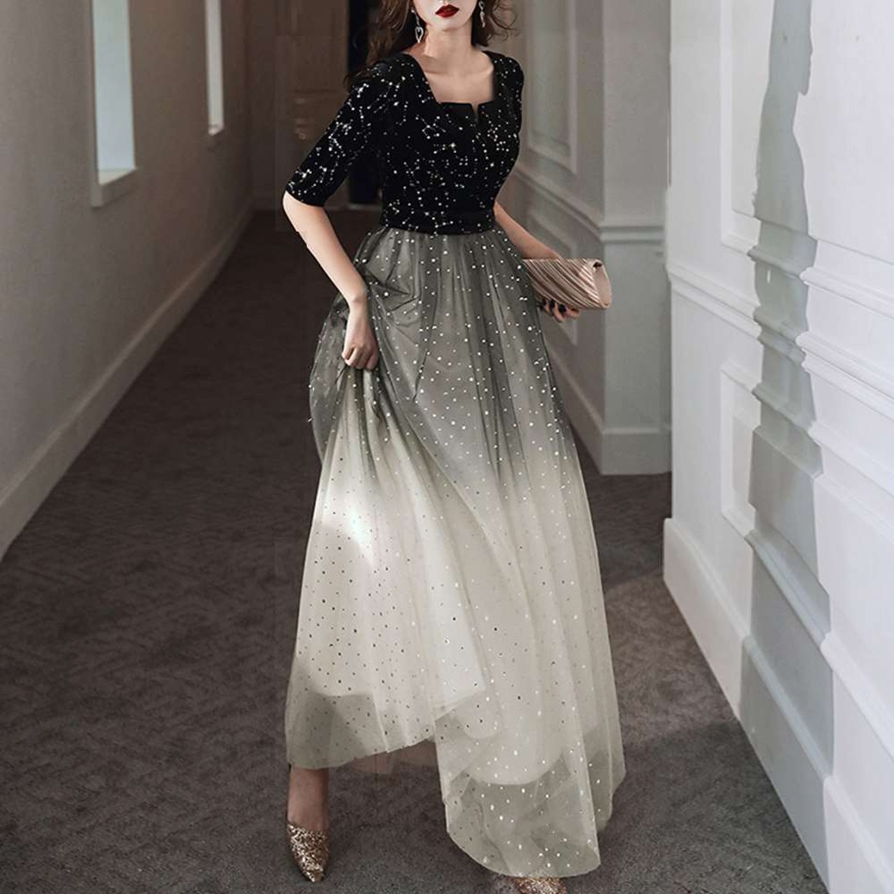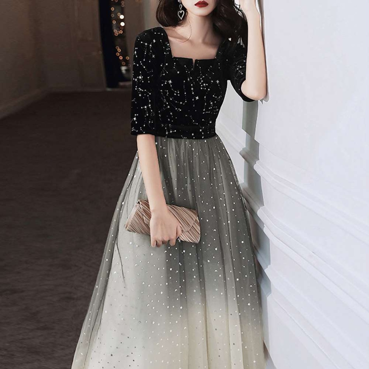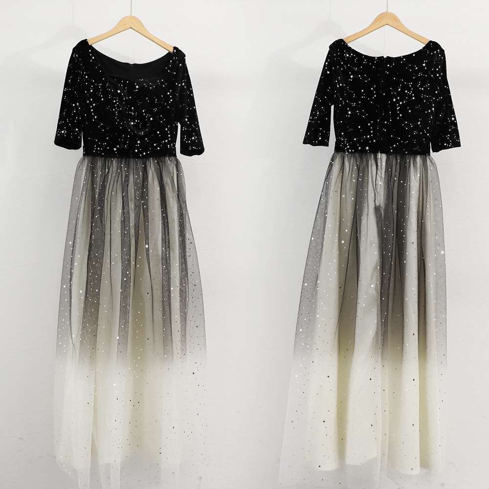 グラデーションとキラキラな星柄が全身にかかったレースを使用したパーティードレス