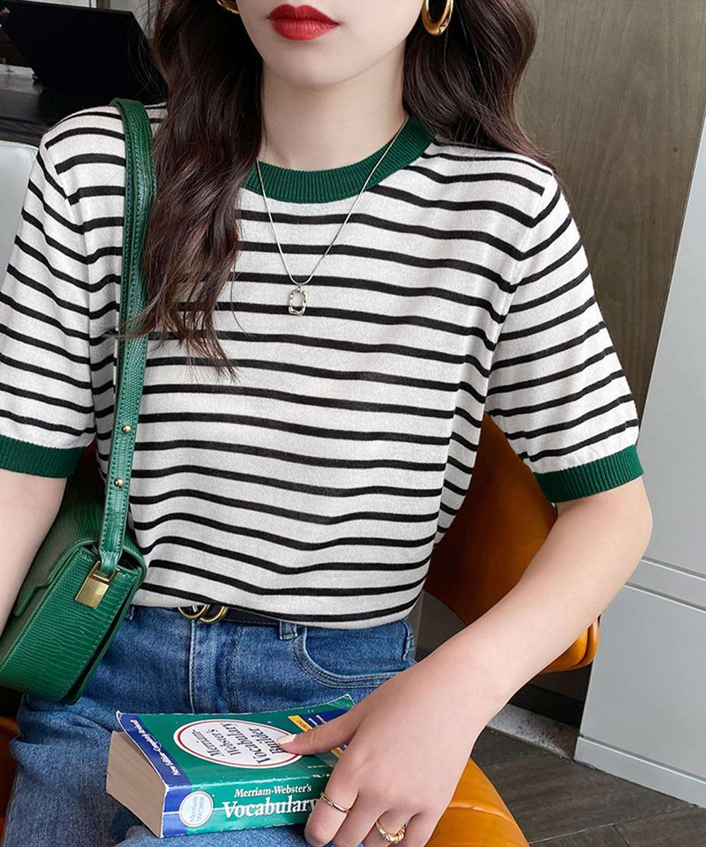 マルチボーダー×配色リブが目を惹く半袖ニットトップス。