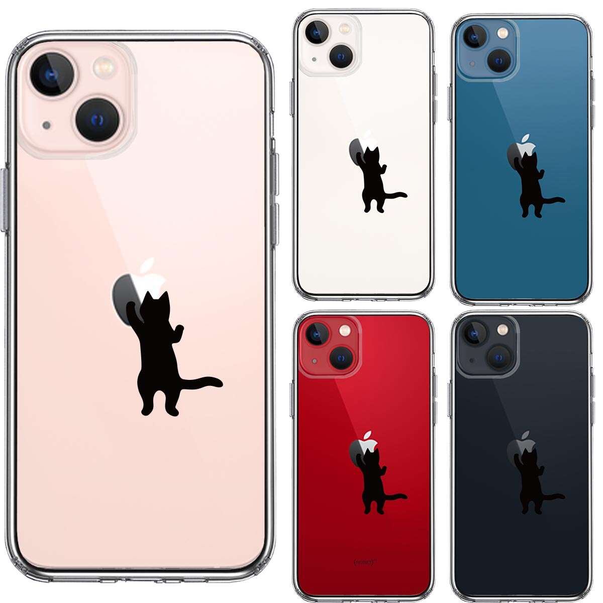 iPhone13mini 側面ソフト 背面ハード ハイブリッド クリア ケース にゃんこ りんご さわさわ 黒