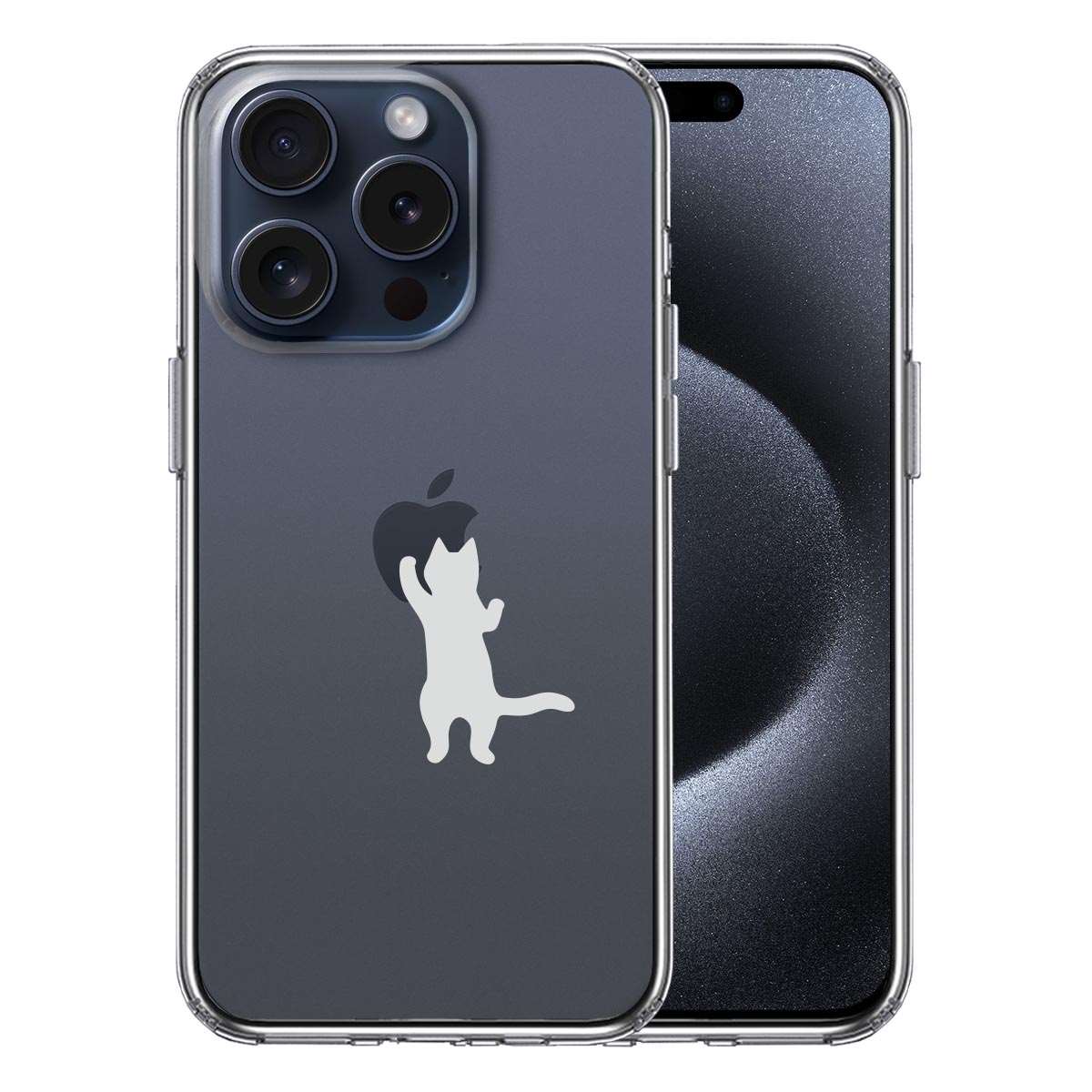 iPhone15 Pro 側面ソフト 背面ハード ハイブリッド クリア ケース にゃんこ りんご さわさわ 薄いグレー