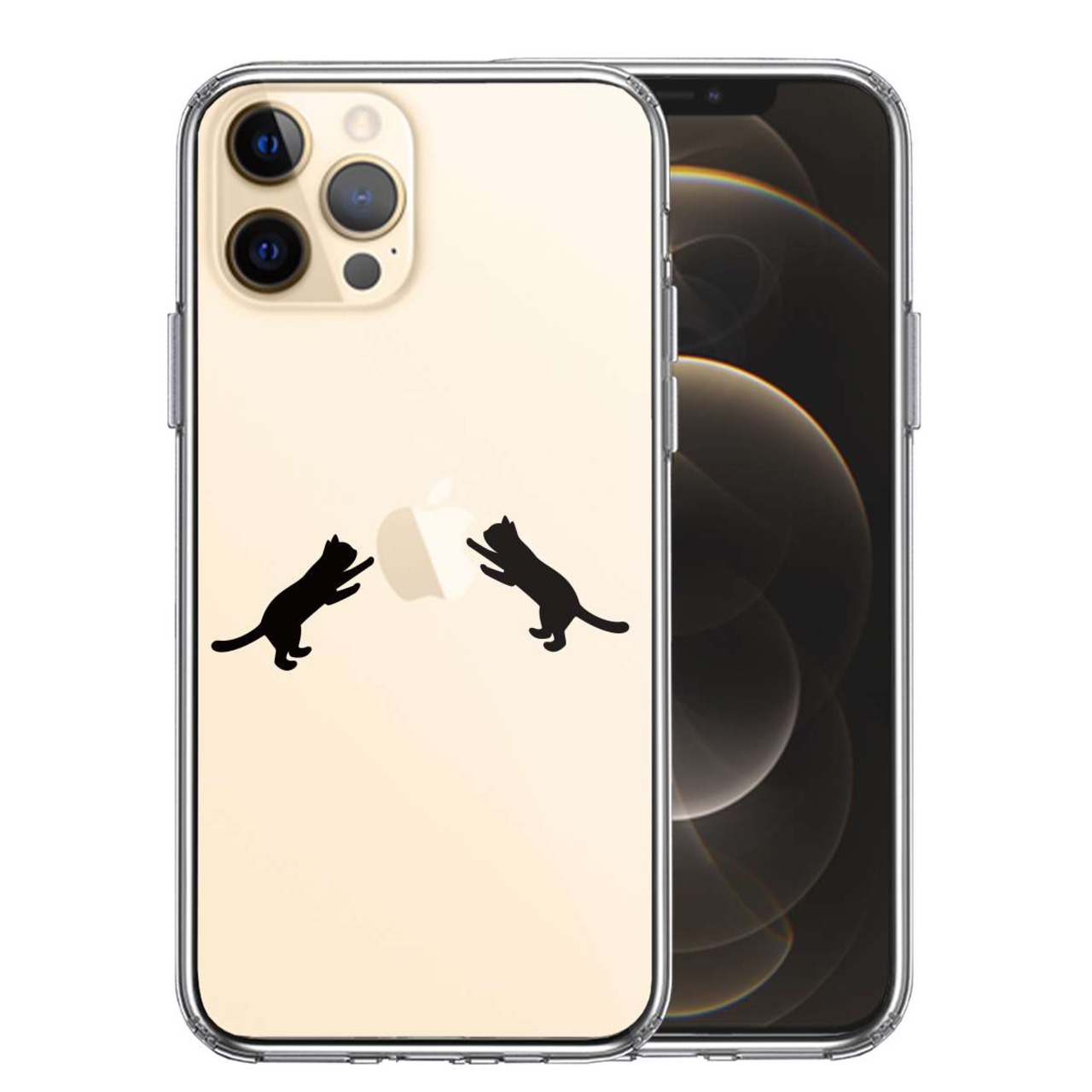 iPhone12 Pro 側面ソフト 背面ハード ハイブリッド クリア ケース にゃんこ ねこ りんご 取り合い 黒