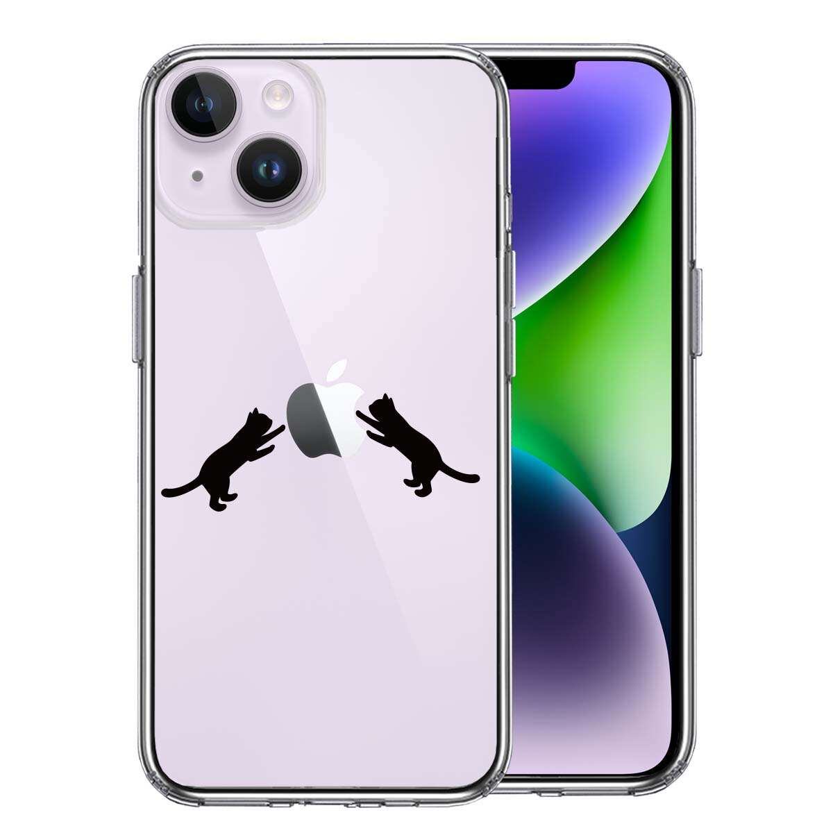 iPhone 14 Plus 側面ソフト 背面ハード ハイブリッド クリア ケース にゃんこ ねこ りんご 取り合い 黒