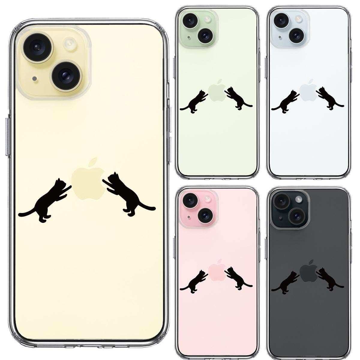 iPhone15 側面ソフト 背面ハード ハイブリッド クリア ケース にゃんこ ねこ りんご 取り合い 黒