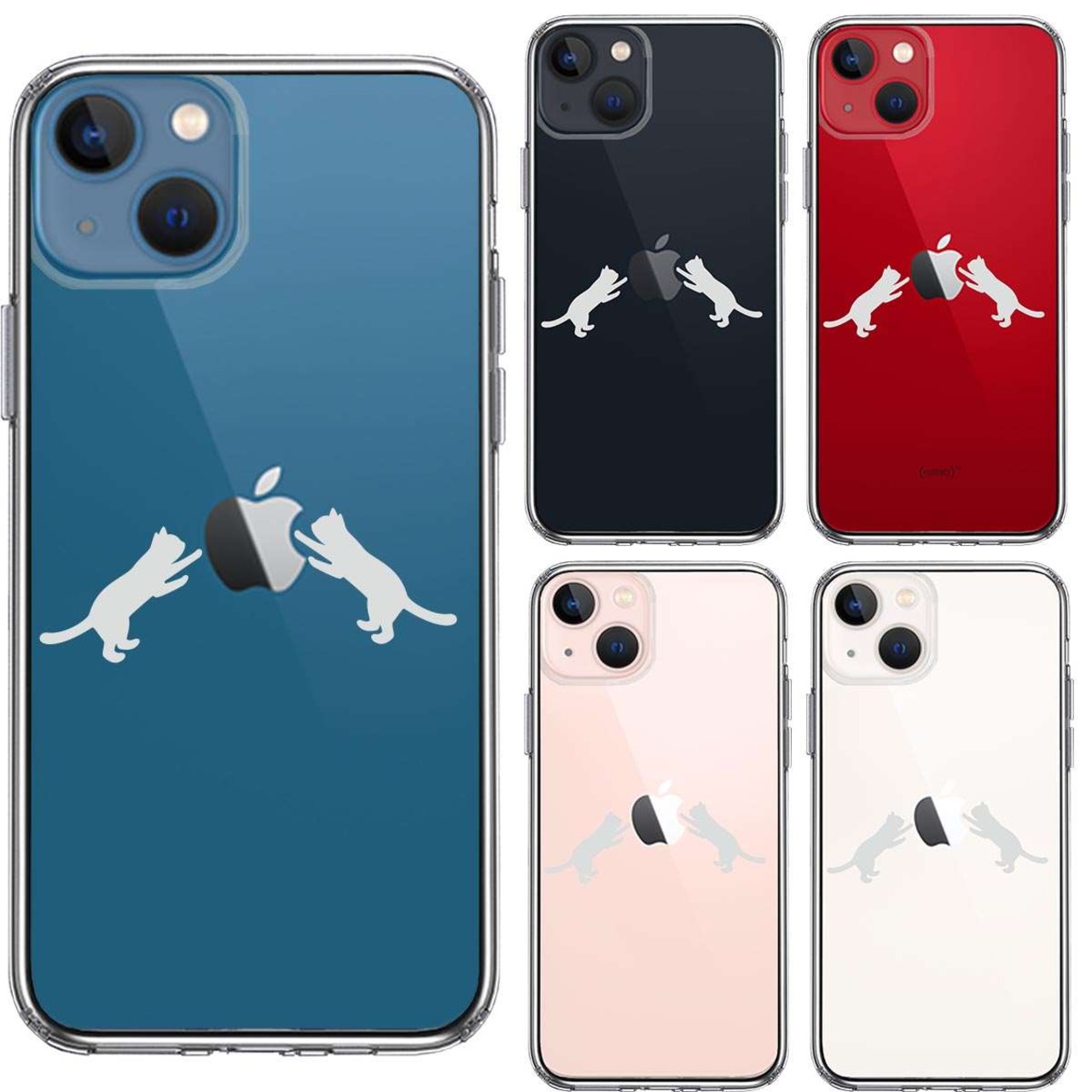 iPhone13 側面ソフト 背面ハード ハイブリッド クリア ケース にゃんこ りんご 取り合い 薄いグレー