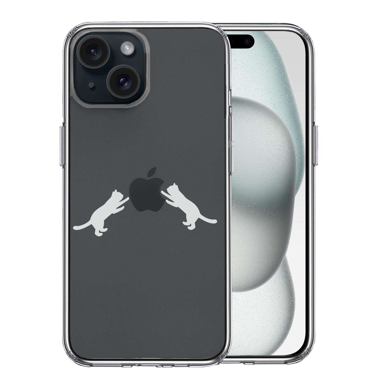 iPhone 15 Plus 側面ソフト 背面ハード ハイブリッド クリア ケース にゃんこ りんご 取り合い 薄いグレー