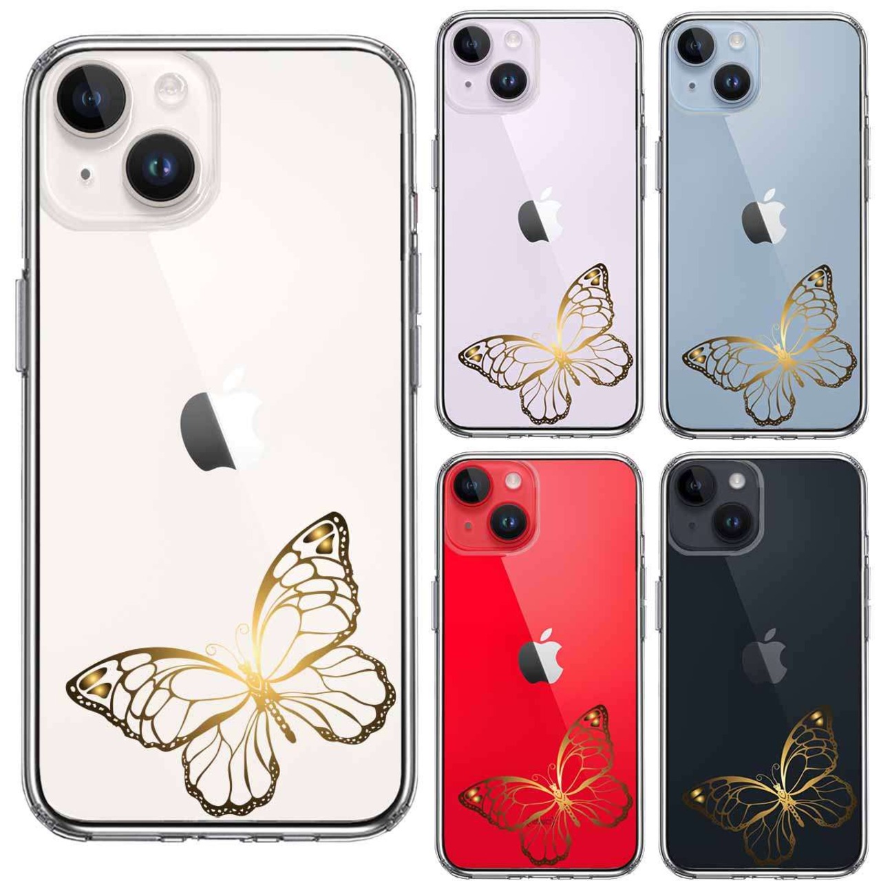iPhone14 側面ソフト 背面ハード ハイブリッド クリア ケース 蝶 ちょうちょう バタフライ ゴールド