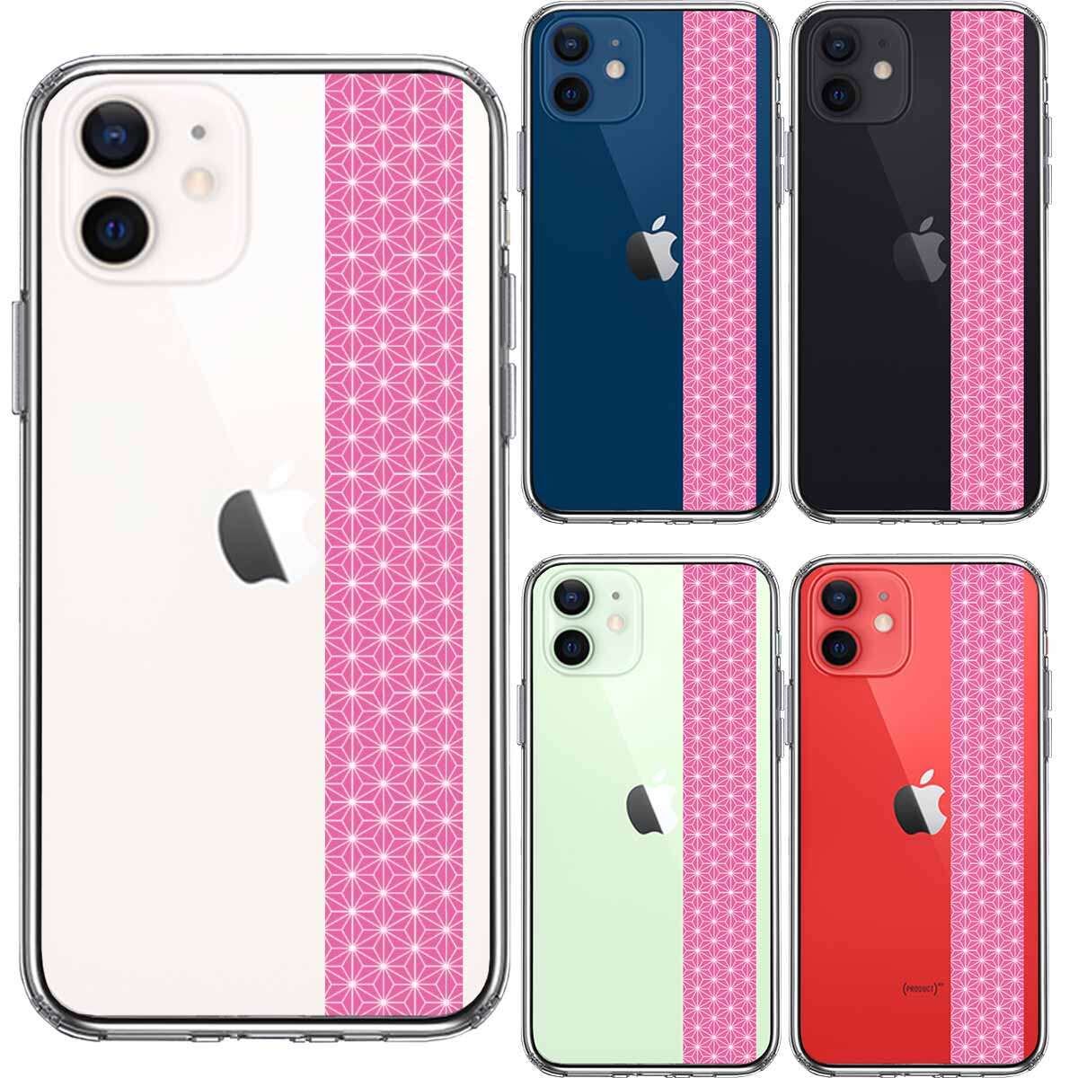 iPhone12mini 側面ソフト 背面ハード ハイブリッド クリア ケース 和柄 帯 麻の葉模様 桃色 ピンク