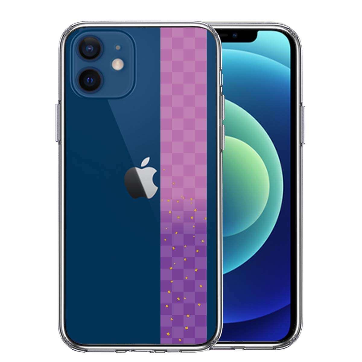 iPhone12mini 側面ソフト 背面ハード ハイブリッド クリア ケース 和柄 帯 市松模様 パープル 紫 金箔