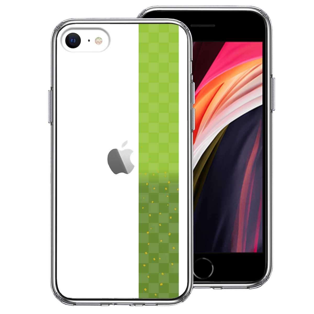 iPhoneSE(第3 第2世代) 側面ソフト 背面ハード ハイブリッド クリア ケース 和柄 市松模様 緑 金箔