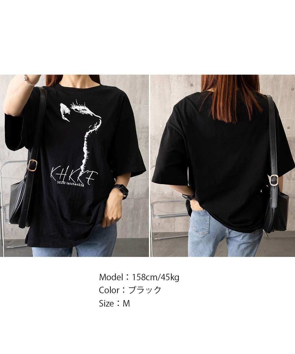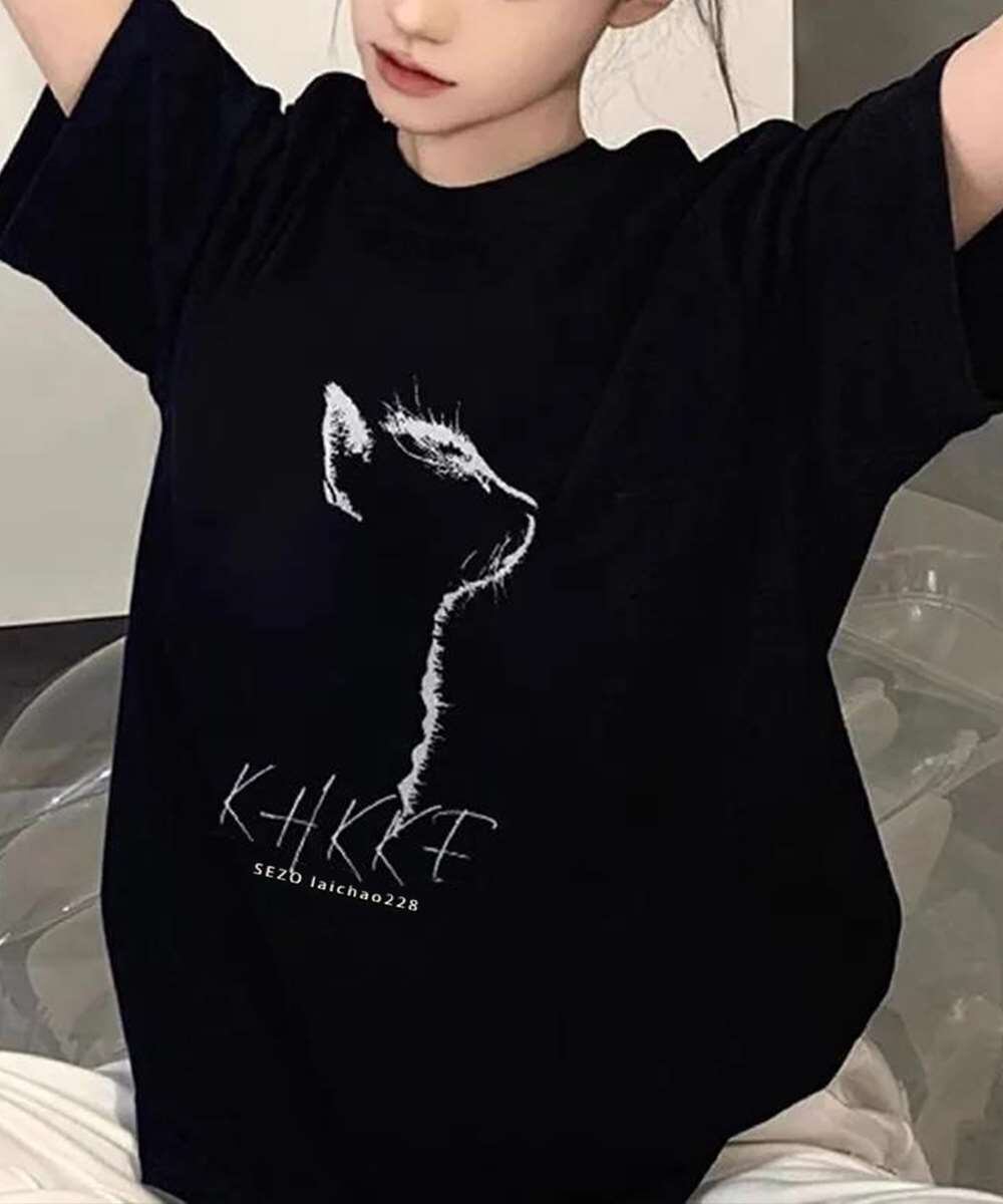 韓国風 イラストTシャツ おしゃれ カジュアルトップス 春夏 ドロップショルダーt ゆったり 着やせ 猫プリントTシャツ