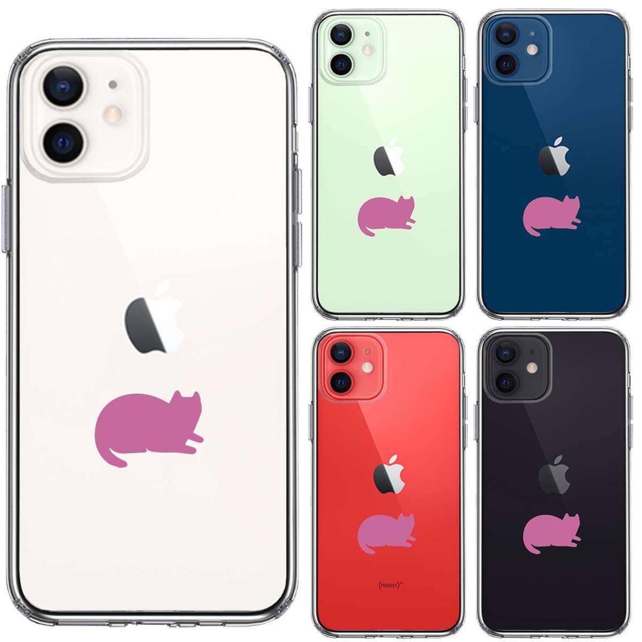 iPhone12 側面ソフト 背面ハード ハイブリッド クリア ケース にゃんこ 伏せ ピンク