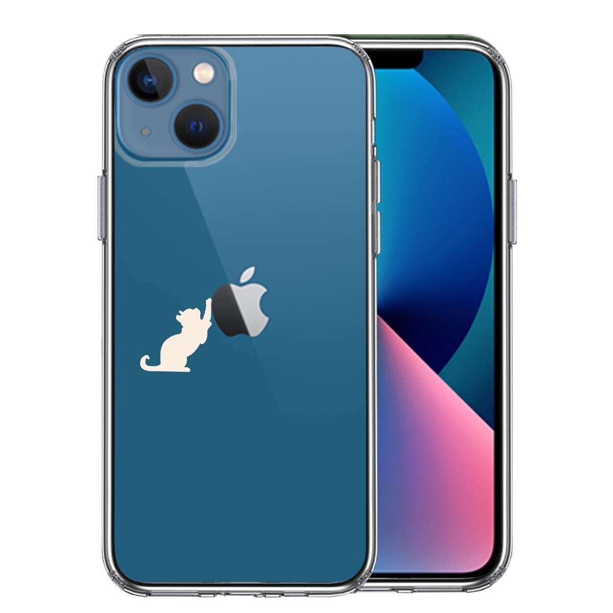 iPhone13mini 側面ソフト 背面ハード ハイブリッド クリア ケース 猫 リンゴ キャッチ ホワイト