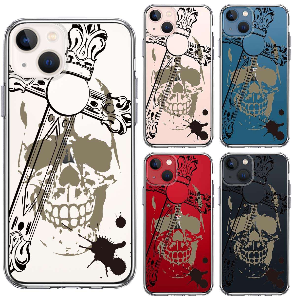 iPhone13 側面ソフト 背面ハード ハイブリッド クリア ケース クロス &スカル