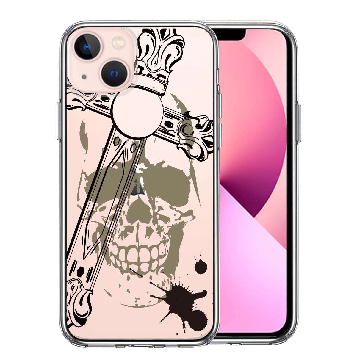 iPhone13mini 側面ソフト 背面ハード ハイブリッド クリア ケース クロス &スカル