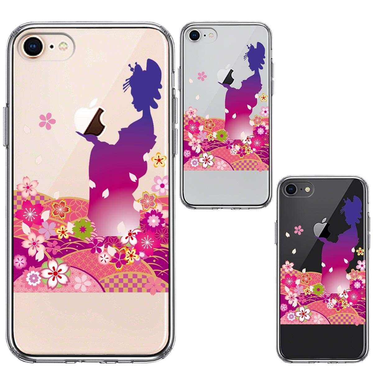 iPhone8 側面ソフト 背面ハード ハイブリッド クリア ケース 日本女性 着物少女 青紫