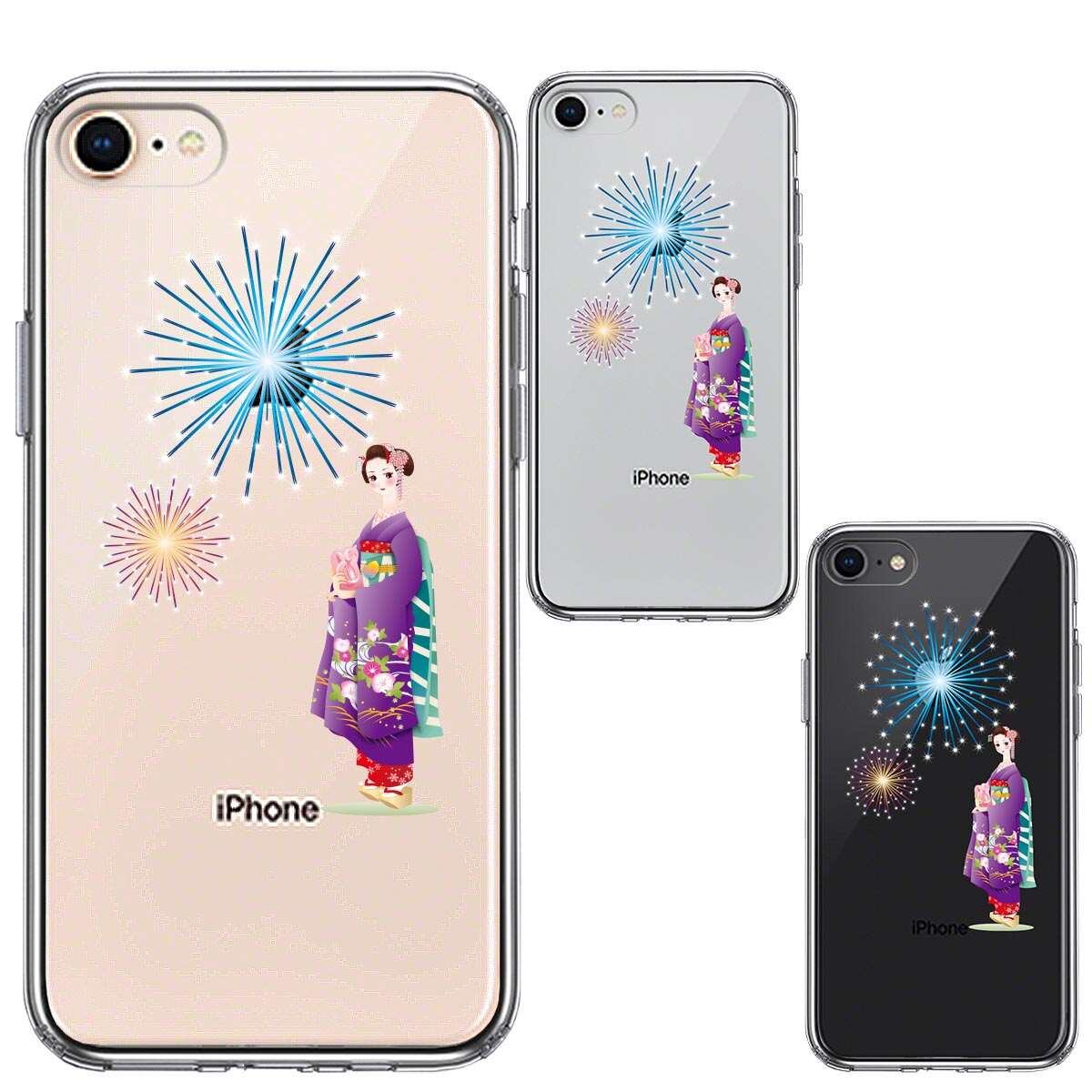 iPhone8 側面ソフト 背面ハード ハイブリッド クリア ケース 花火と着物女性